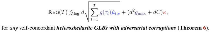 We consider the problem of heteroskedastic generalized linear bandits (GLBs) with adversarial corruptions, which subsumes various stochastic contextual bandit settings, including heteroskedastic linear bandits and logistic/Poisson bandits. We propose HCW-GLB-OMD, which consists of two components: an online mirror descent (OMD)-based estimator and Hessian-based confidence weights to achieve corruption robustness. This is computationally efficient in that it only requires $O(1)$ space and time complexity per iteration. Under the self-concordance assumption on the link function, we show a regret bound of $\tilde{O}\left( d \sqrt{\sum_t g(\tau_t) \mu_{t,\star}} + d^2 g_{\max} \kappa + d \kappa C \right)$, where $\mu_{t,\star}$ is the slope of $\mu$ around the optimal arm at time $t$, $g(\tau_t)$’s are potentially exogenously time-varying dispersions (e.g., $g(\tau_t) = \sigma_t^2$ for heteroskedastic linear bandits, $g(\tau_t) = 1$ for Bernoulli and Poisson), $g_{\max} = \max_{t \in [T]} g(\tau_t)$ is the maximum dispersion, and $C \geq 0$ is the total corruption budget of the adversary. We complement this with a lower bound of $\tilde{\Omega}(d \sqrt{\sum_t g(\tau_t) \mu_{t,\star}} + d C)$, unifying previous problem-specific lower bounds. Thus, our algorithm achieves, up to a $\kappa$-factor in the corruption term, instance-wise minimax optimality simultaneously across various instances of heteroskedastic GLBs with adversarial corruptions.